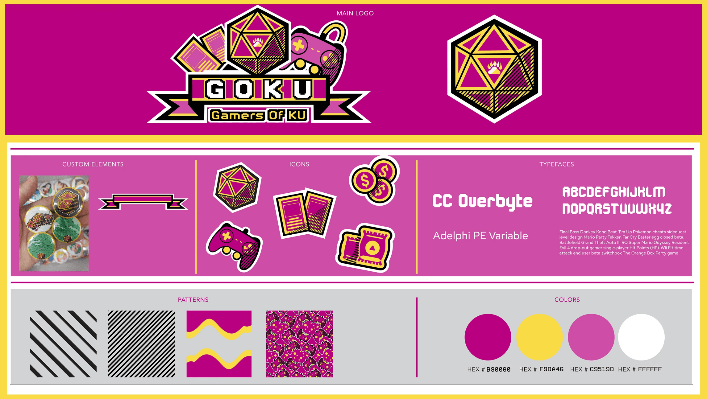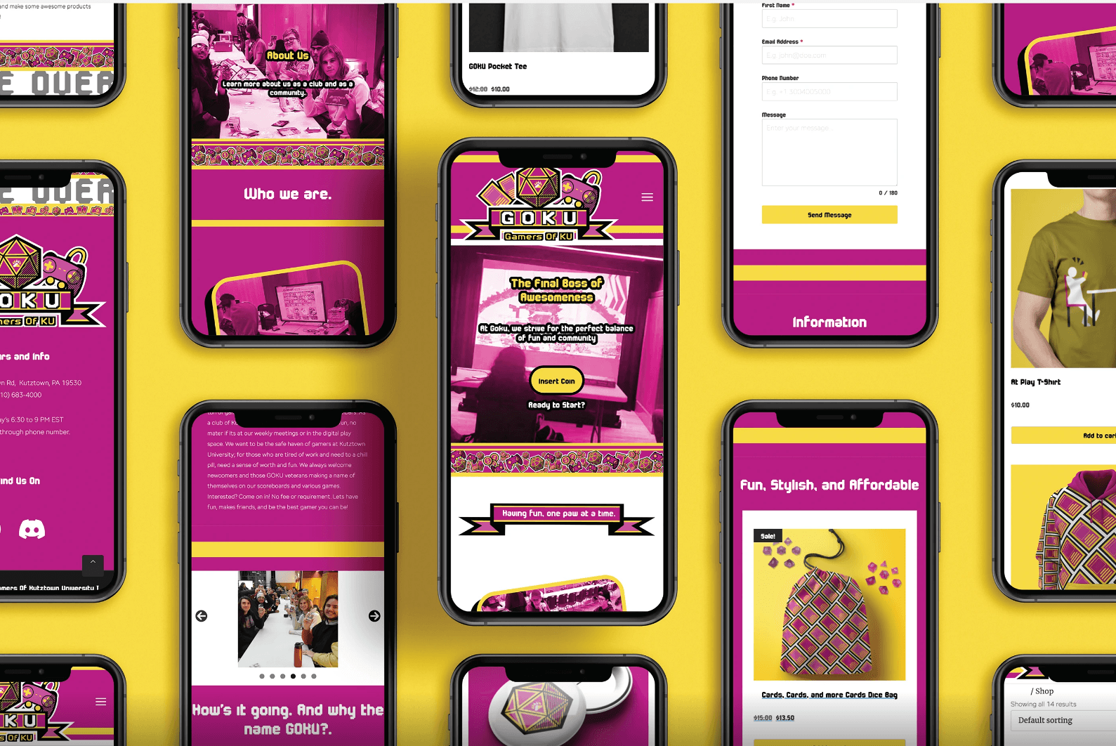 GOKU, also known as Gamers of Kutztown University, is a public club on Kutztown University’s campus that hosts various game nights and group connections. Here, the club specializes in different areas of setup to play video games or board games and have fun. This project serves as a rebrand to GOKU’s main club branding, and to give them an ecommerce site to advertise, contact and sell merch to support the club. With well-organized pages inside of wordpress and the flashy colors of the club, GOKU aims for every to get their game on!